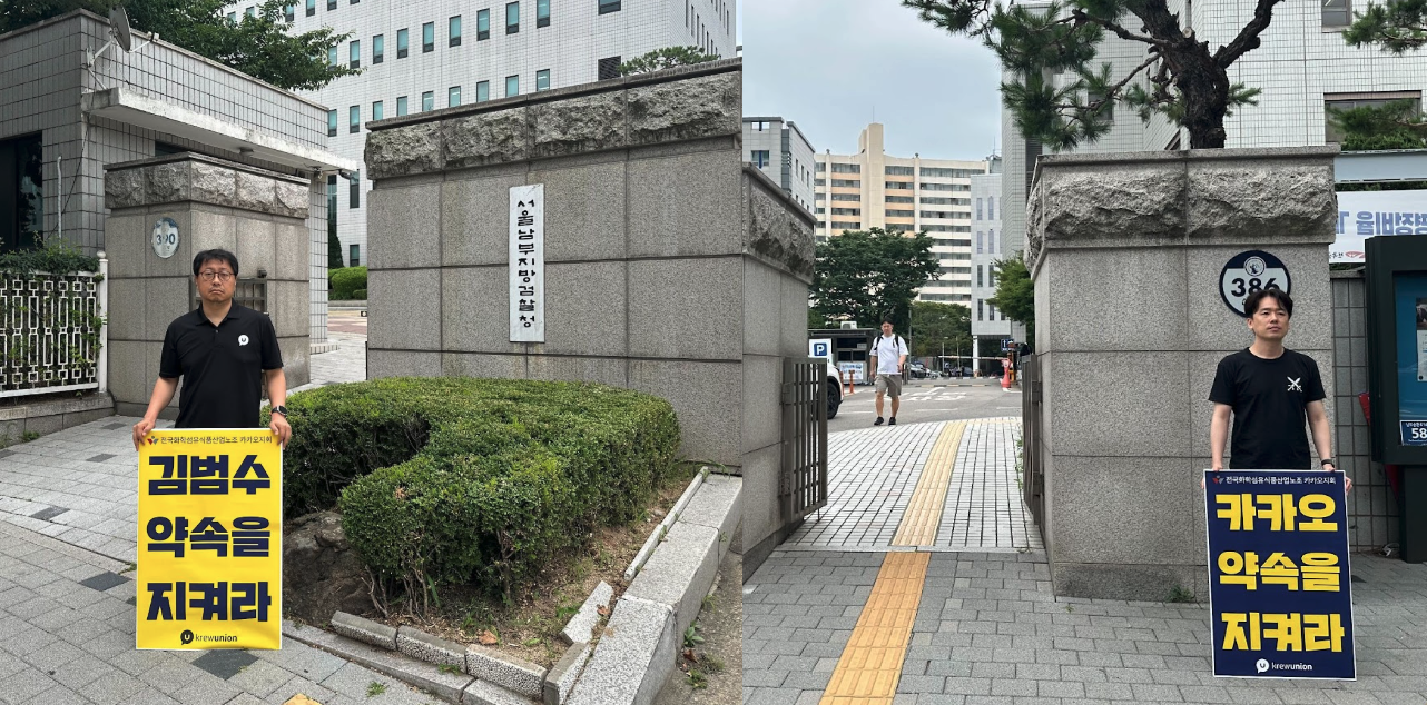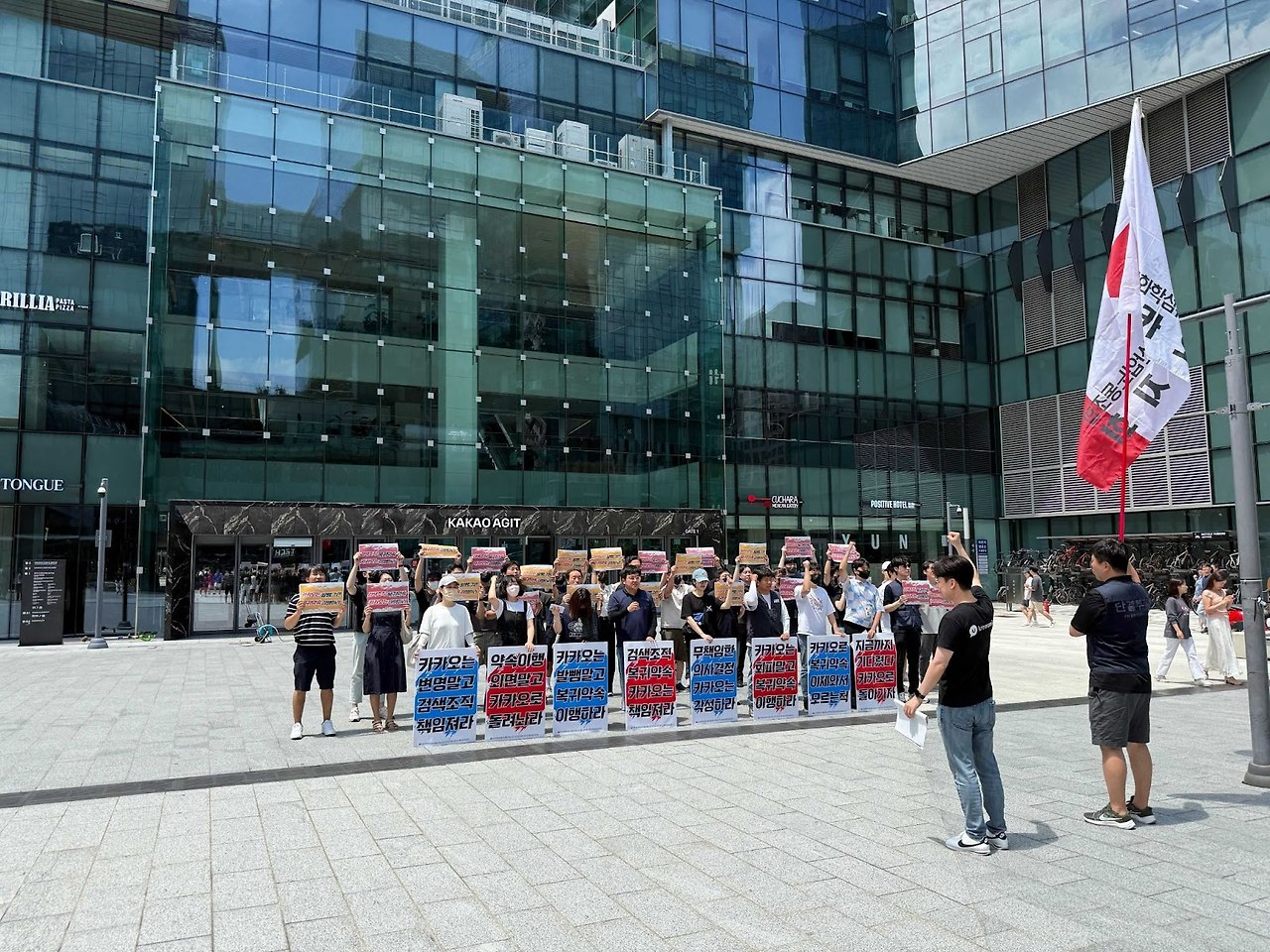 전국화학섬유식품산업노조 카카오지회(이하 ‘카카오노조’)는 지난 7월 4일과, 7월 25일 김범수 창업자의 SM엔터테인먼트 관련 공판이 진행되는 서울남부지방법원 앞에서 카카오엔터프라이즈 검색CIC 고용불안 해결을 요구하는 피켓시위를 진행했다고 알렸다. 또한 카카오노조는 7월 24일 카카오 본사 앞에서 조합원 30여명이 참여하는 대규모 피켓시위를 진행했다.