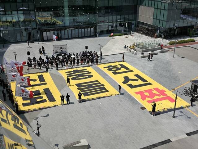 노조는 집회 현장에서 카카오의 대표적 조직 문화로 꼽히던 '신뢰·충돌·헌신'이 적힌 현수막을 바닥에 깔고 발로 밟는 퍼포먼스를 진행, 경영진에 대한 비판의 뜻을 드러냈다.