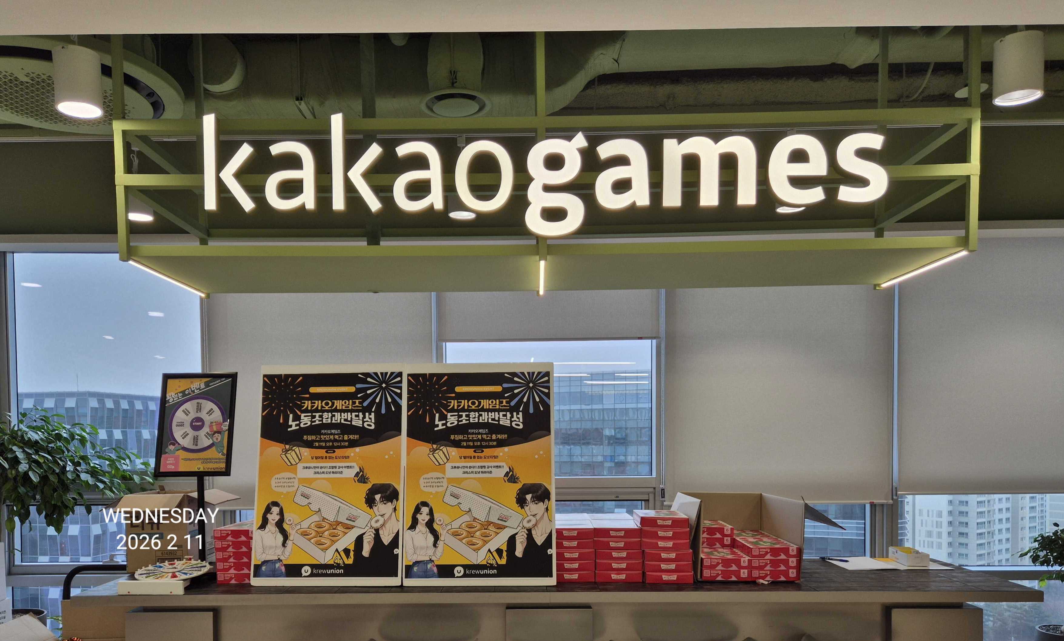 전국화학섬유식품산업노동조합 카카오지회(지회장 서승욱, 이하 ‘카카오지회’)는 23일 카카오게임즈 법인의 노동조합 가입자 수가 전체 임직원 대비 절반을 초과하여 가입해 과반을 돌파했다고 밝혔다. 과거 카카오모빌리티, 카카오에 이어 3번째 과반달성이다. 카카오지회는 카카오게임즈 조합원들을 위해 11일 점심 시간에 과반노조 달성을 기념하고 그동안 뜻을 함께해 준 조합원들에게 감사를 전하기 위해 ‘과반 달성 축하 도넛 나눔 이벤트’를 진행했다. 이번 행사를 위해 준비된 도넛 300박스는 배포 시작 직후 조합원들의 뜨거운 호응 속에 빠르게 소진되었다. 행사에 참여한 한 조합원은 “최근 매각설로 마음이 어수선했는데, 노동조합이 과반을 달성했다는 소식과 함께 동료들과 도넛을 나누니 우리가 하나로 연결되어 있다는 확신이 든다”고 소회를 밝혔다. 지회 측은 이번 이벤트가 단순한 간식 나눔을 넘어, 불안한 경영 상황 속에서 크루들이 서로의 손을 잡는 연대의 장이 되었다고 평가했다.