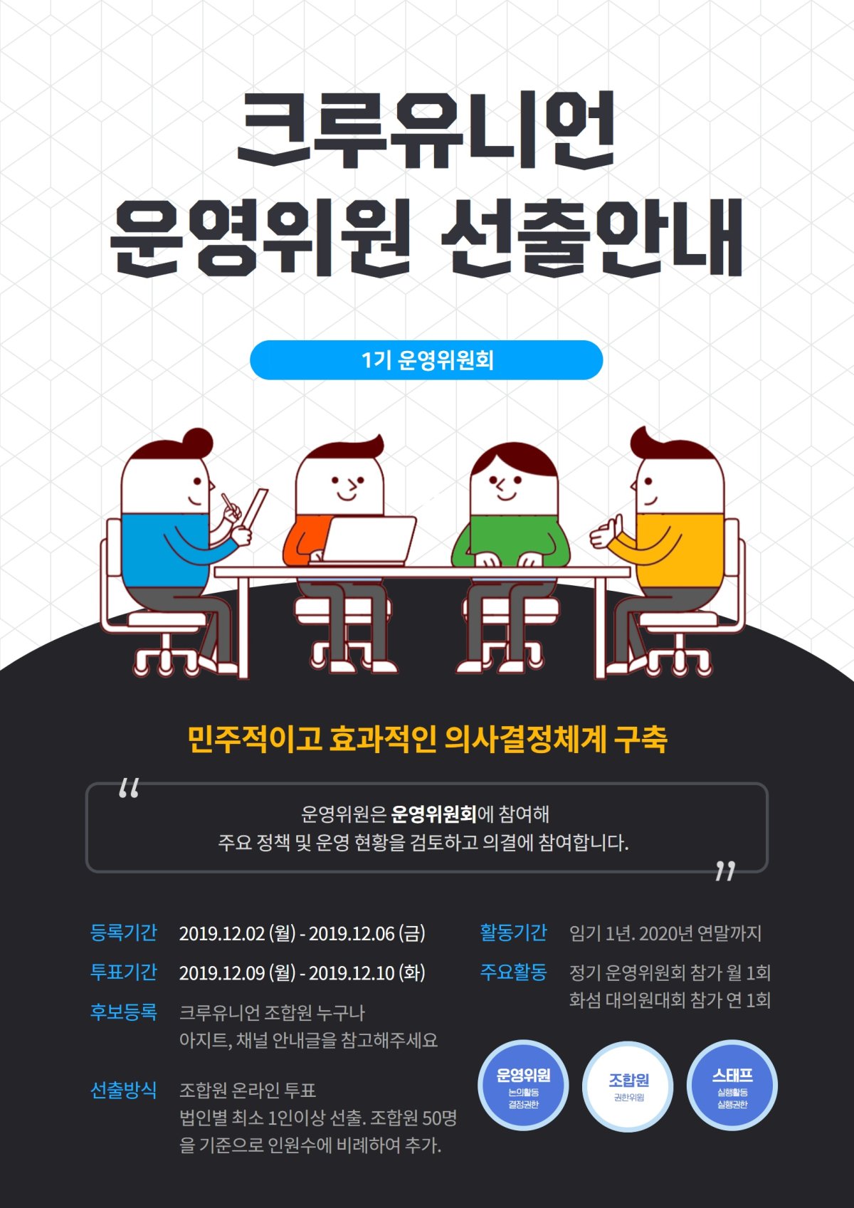 | 후보등록 : 크루유니언 조합원 누구나 등록기간 : 2019.12.02 (월) ~ 2019.12.06 (금) 투표기간 : 2019.12.09 (월) ~ 2019.12.10 (화) 선출인원 : 조합원 50명을 기준으로 인원수에 비례하여 선출합니다. (후보등록마감일 기준) 활동기간 : 1년. 선출투표이후 2020년 연말까지 주요활동 : 정기 운영위원회 참가 (월1회) / 화섬 대의원대회 참가 (연1회) 등 논의/의사결정과정에 참여 |