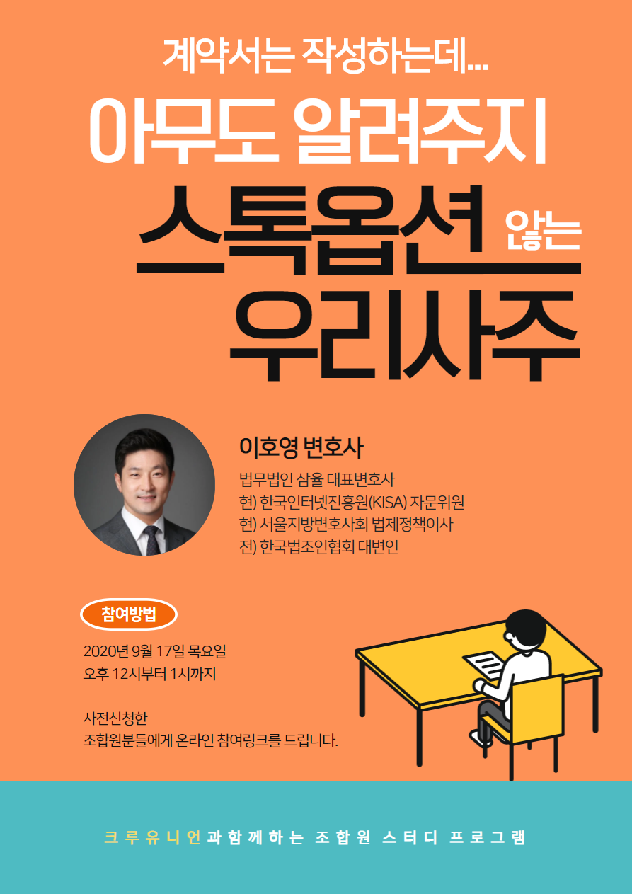 크루유니언에서 조합원 스터디 프로그램으로 '*스톡옵션과 우리사주'를 준비하고 있습니다.