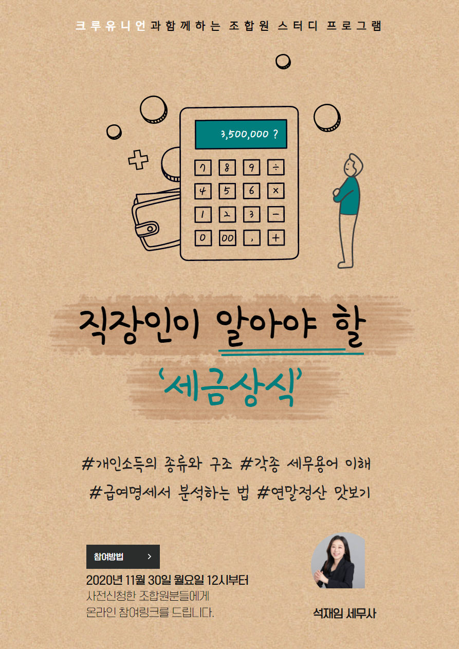 크루유니언에서 조합원 스터디 프로그램으로 '​직장인이 알아야할 세금상식​'를 준비했습니다.