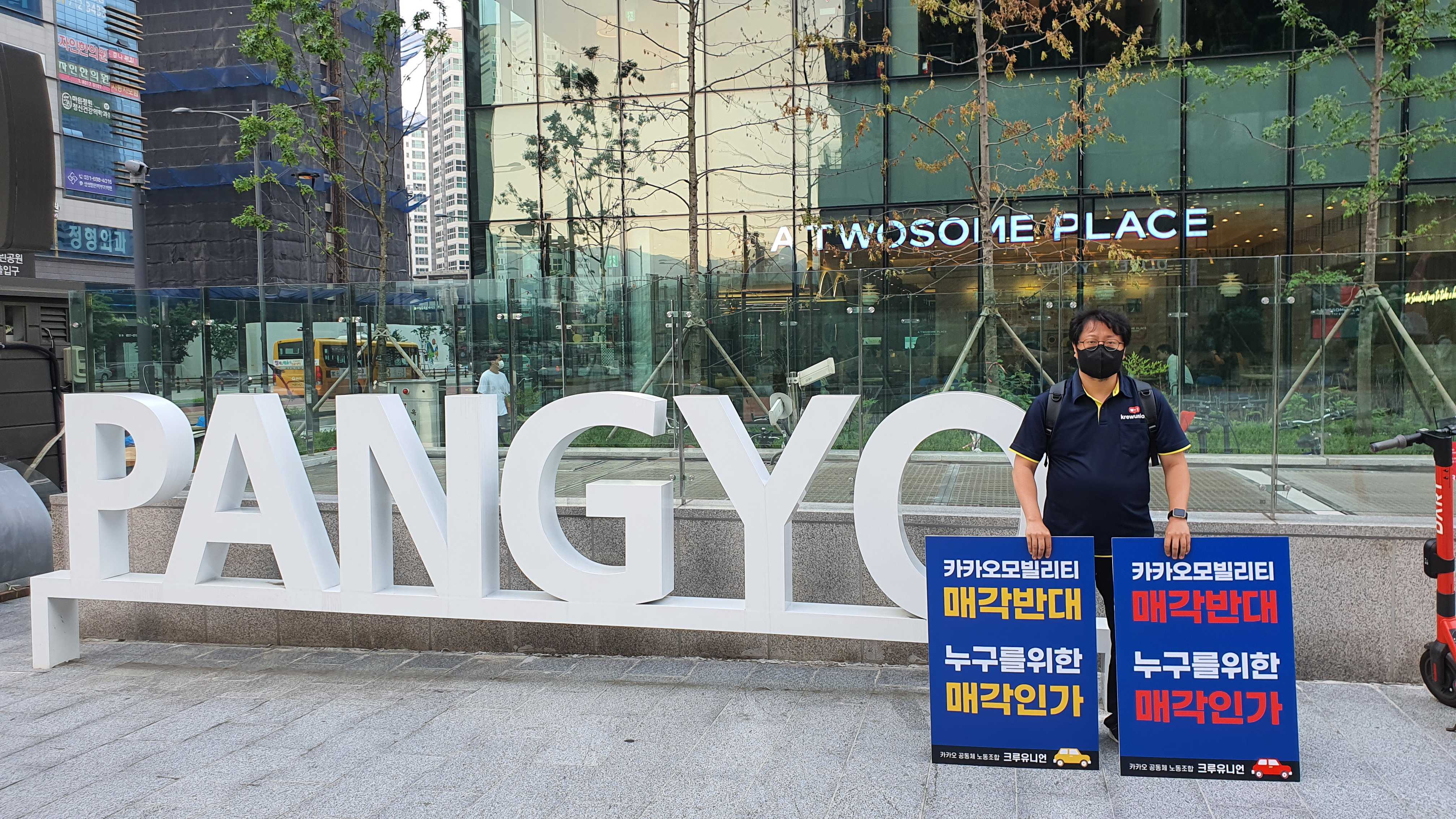 (카카오노동조합 서승욱 지회장이 판교역 광장에서 카카오모빌리티 매각반대 1인 시위를 하고 있다. 2022.07.05 카카오노동조합 제공)