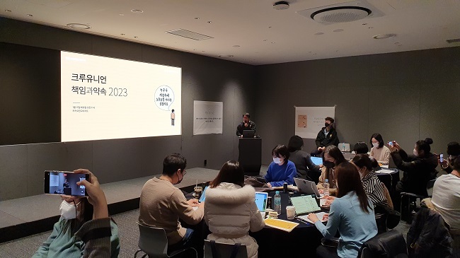 카카오지회는 17일 오전 성남 분당구 카카오판교아지트에서 '크루유니언 책임과 약속 2023' 기자간담회를 개최했다. 카카오지회는 전날 카카오가 재택근무 폐지를 결정하면서 노조 가입률이 급증해 노사 갈등이 표면화되고 있다는 언론 보도 내용에 관해 입장을 밝히고, 지난 4년여 간의 성장과 향후 노조 운영 방향 등을 발표했다.
