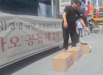 이들은 판교 아지트에서 출발해 엑스엘게임즈가 있는 네오위즈 본사, 그리고 카카오엔터프라이즈가 입주한 판교 H스퀘어 앞까지 40~50분 거리 행진을 이어갔다. 행진 전후로, 노조는 ‘불통’·‘탐욕’ ·‘일방적 리더십’ 등 문구가 새겨진 박스를 밟으며 회사에 조속한 사과를 요구하기도 했다.