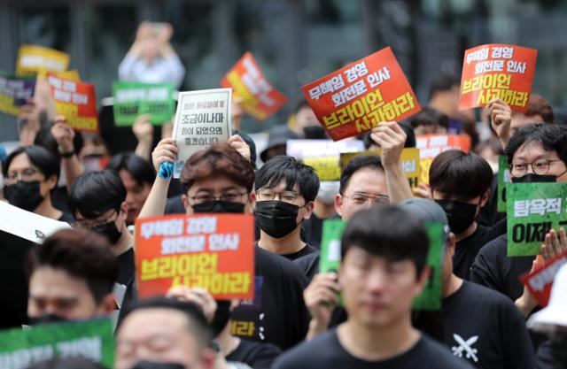 지난 7월 민주노총 화섬식품노조 카카오지회 조합원들이 26일 경기 성남시 카카오 판교아지트 앞 광장에서 '무책임경영 규탄·고용불안 해소를 위한 집회'를 열고 구호를 외치고 있다. 뉴시스