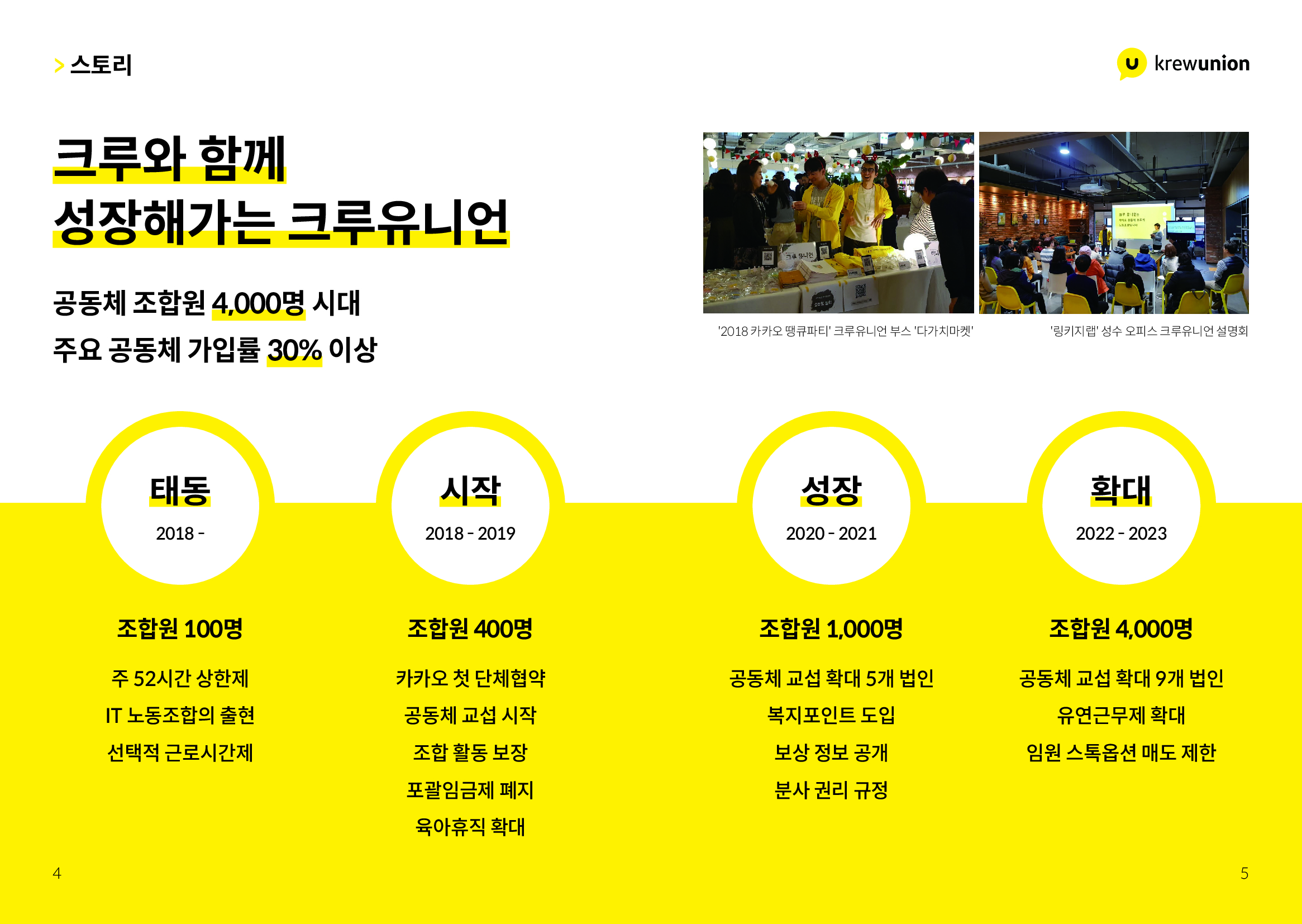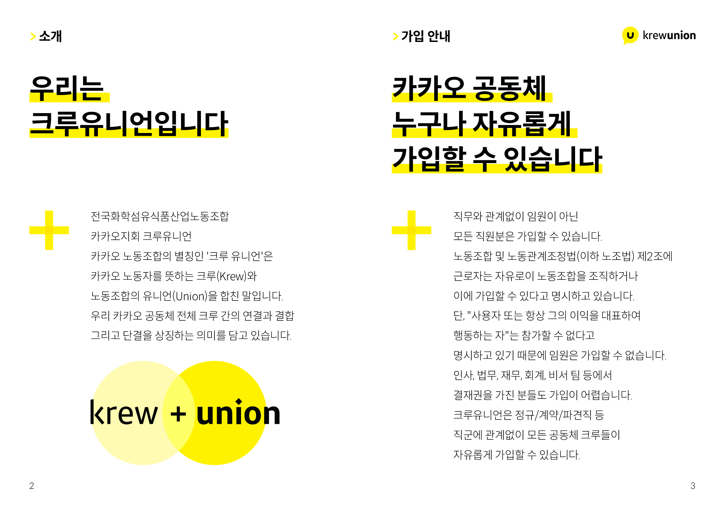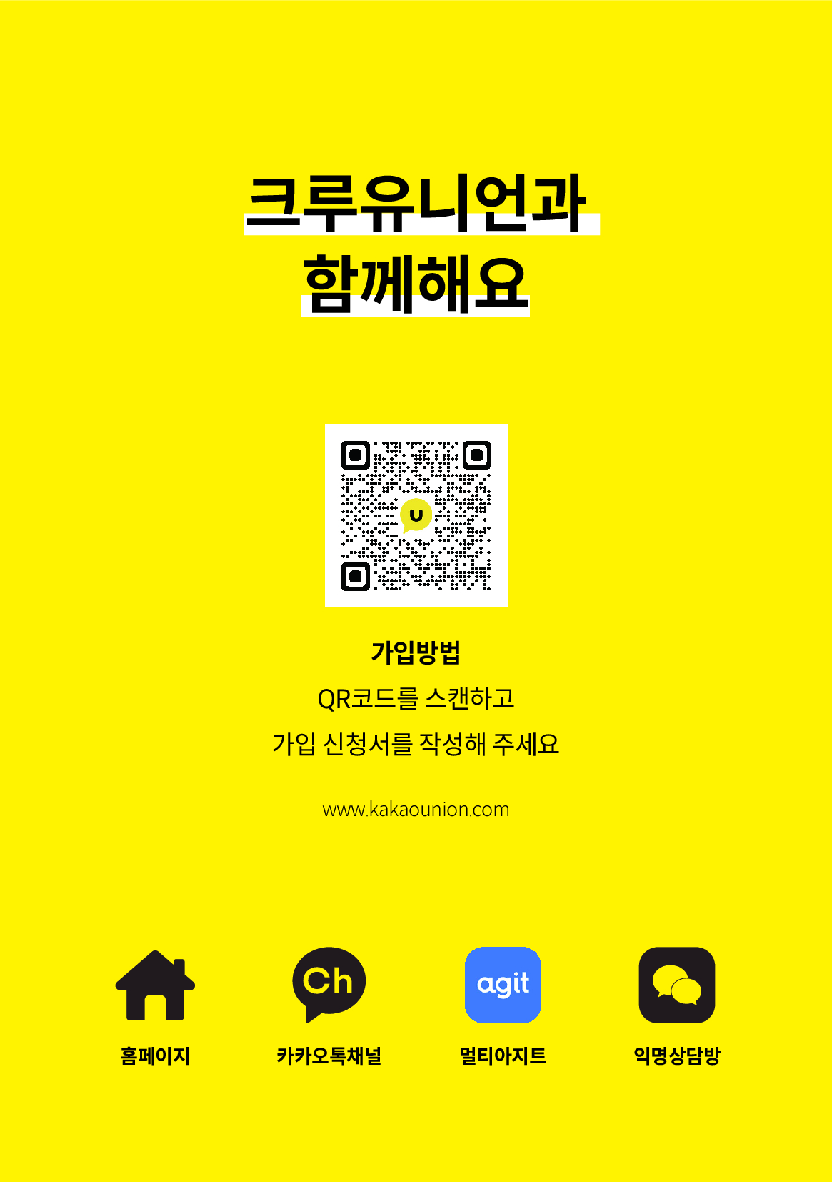 전국화학섬유식품산업노동조합 카카오지회 크루유니언. 카카오 노동조합의 별칭인 '크루 유니언'은 카카오 노동자를 뜻하는 크루(Krew)와 노동조합의 유니언(Union)을 합친 말입니다. 우리 카카오 공동체 전체 크루 간의 연결과 결합 그리고 단결을 상징하는 의미를 담고 있습니다.