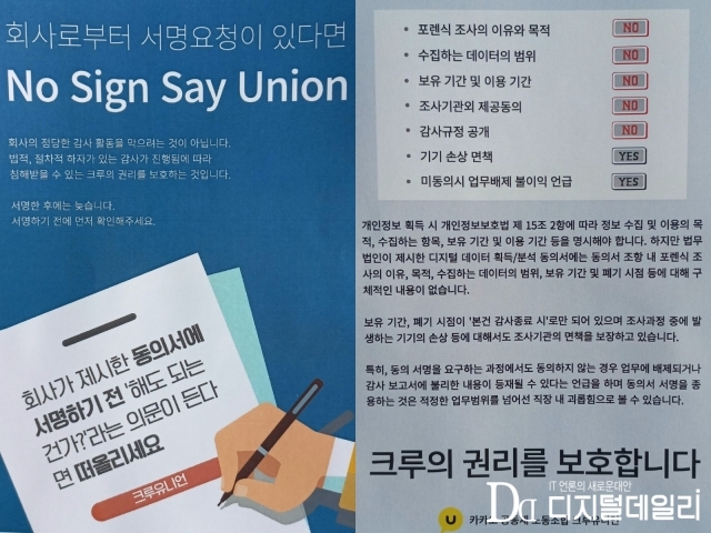 이날 노조는 피케팅에 앞서 카카오 판교아지트 내 식당에서 ‘회사로부터 서명 요청을 받으면 먼저 노조 측에 말해달라’라는 내용의 전단지를 직원들에게 배포하기도 했다.