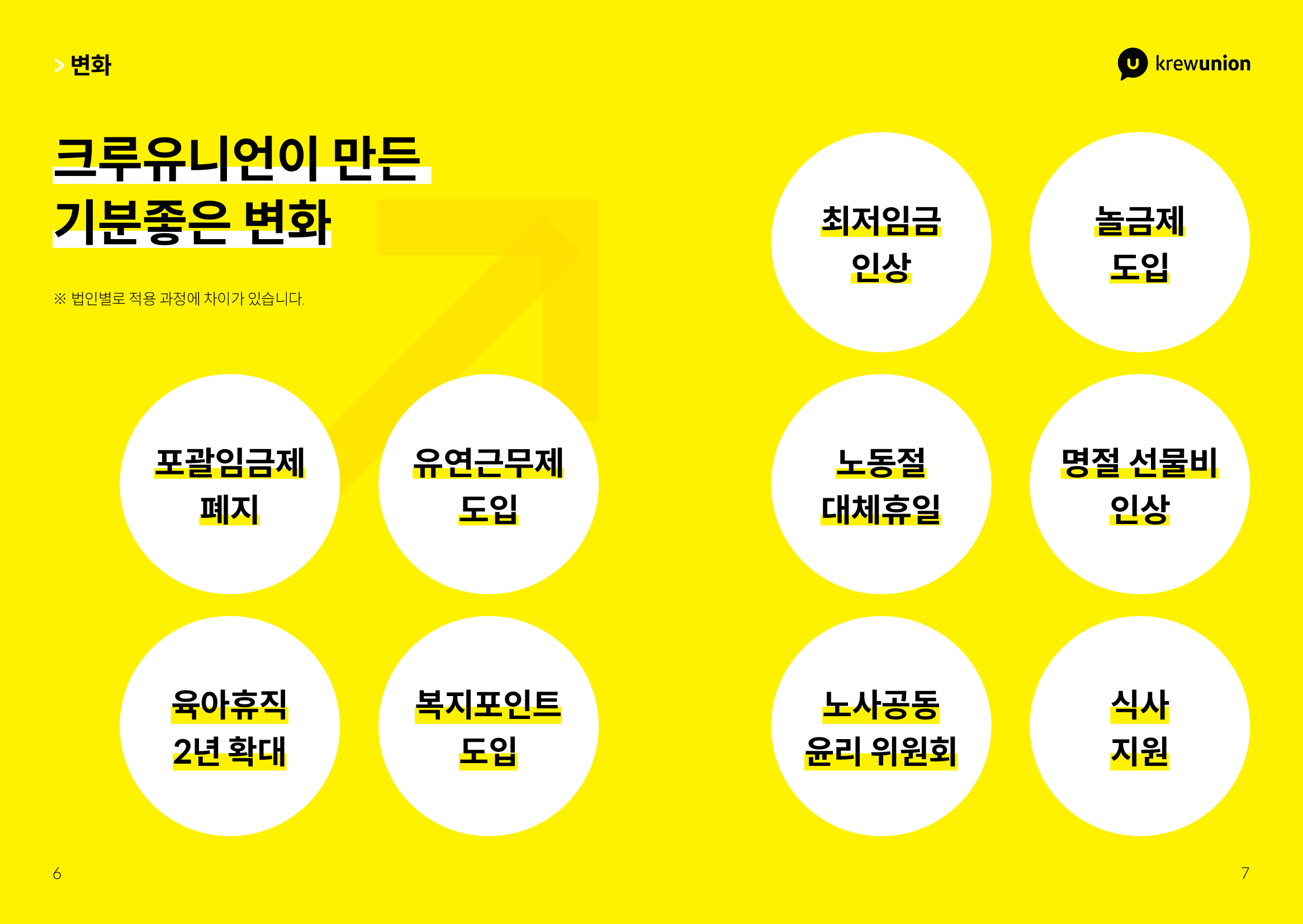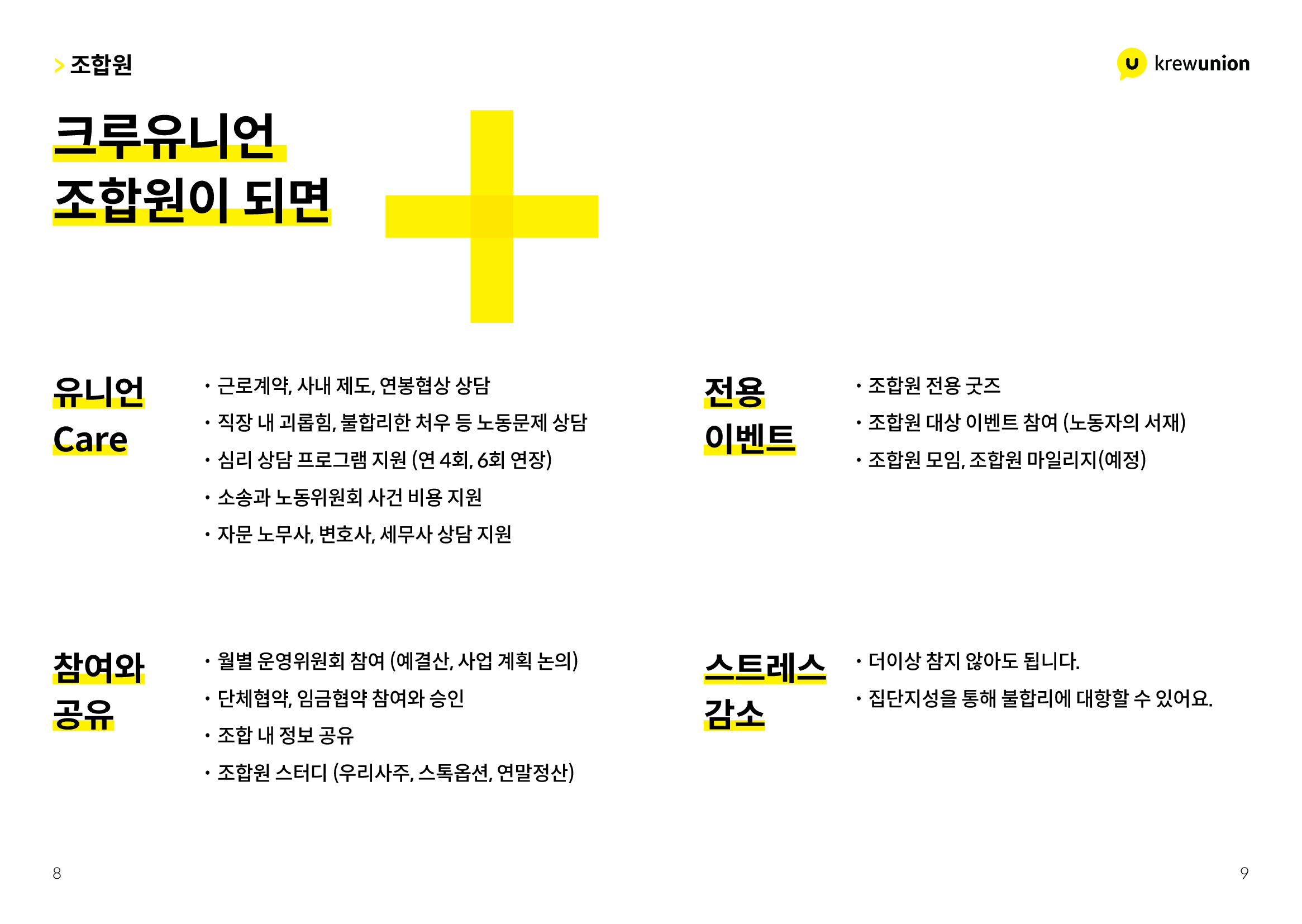 전국화학섬유식품산업노동조합 카카오지회 크루유니언. 카카오 노동조합의 별칭인 '크루 유니언'은 카카오 노동자를 뜻하는 크루(Krew)와 노동조합의 유니언(Union)을 합친 말입니다. 우리 카카오 공동체 전체 크루 간의 연결과 결합 그리고 단결을 상징하는 의미를 담고 있습니다.