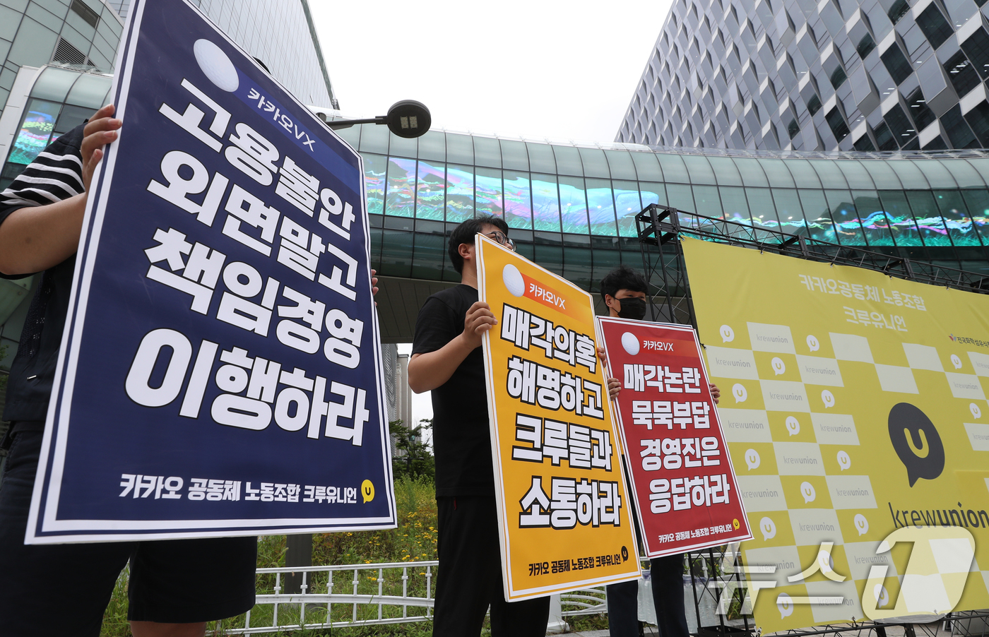 카카오 노동조합(전국화학섬유식품산업노동조합 카카오지회)은 카카오 그룹 계열사 매각 논란에 경영진의 적극적인 소통을 요구했다. 29일 오후 경기 성남시 분당구 카카오 판교아지트 앞에서 카카오노조는 "매각 의혹 해명하고, 크루(직원)들과 소통하라"며 피켓시위를 진행했다. 현재 카카오VX를 시작으로 카카오게임즈(293490), SM엔터테인먼트(041510) 등 카카오(035720) 계열사 매각 가능성이 꾸준히 거론되고 있다. 카카오는 "계열사 매각 의혹은 사실무근"이라고 했고, 카카오게임즈(293490)는 공시를 통해서도 매각 의혹을 부인한 상태다.